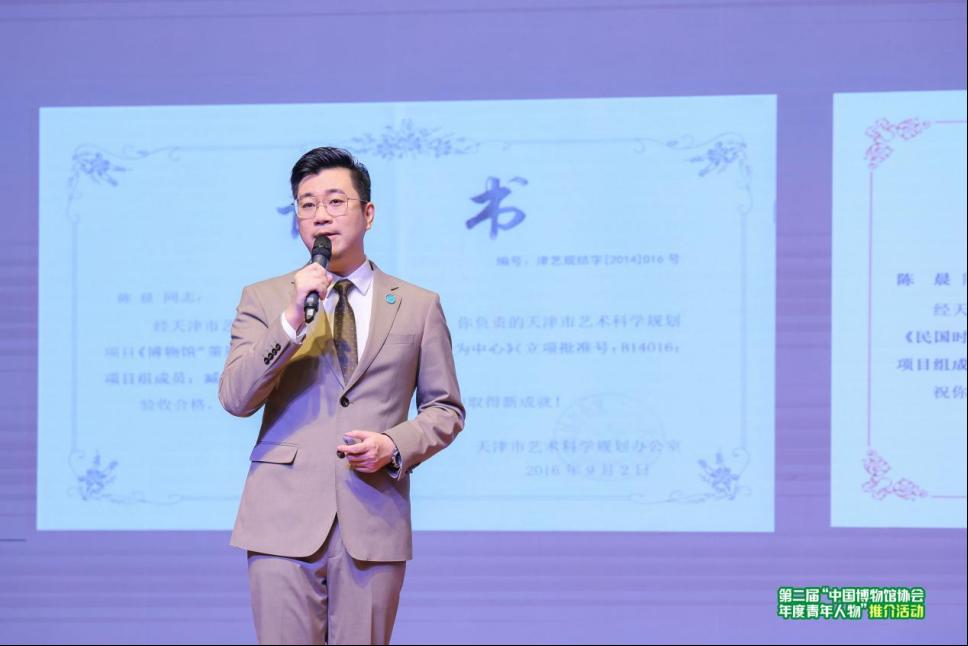 第二届“中国博物馆协会年度青年人物”推介活动于2025年2月正式启动,经中国博物馆协会各专委会、各会员单位推介,共有57人通过初评。2025年4月,经专家评审,产生19位候选人进入终评。在5月9日天津博物馆举办的终评会上,19位青年候选人首先进行5分钟自由演讲,之后回答提问,10位来自文博、传媒、慈善等多个行业的资深专家担任推介官,根据申报材料、业务能力、现场演讲、现场答问、精神风貌等进行现场打分,最终按照得分高低产生10位首届“中国博物馆协会年度青年人物”。陈晨老师最终以全场第二名的成绩入选。