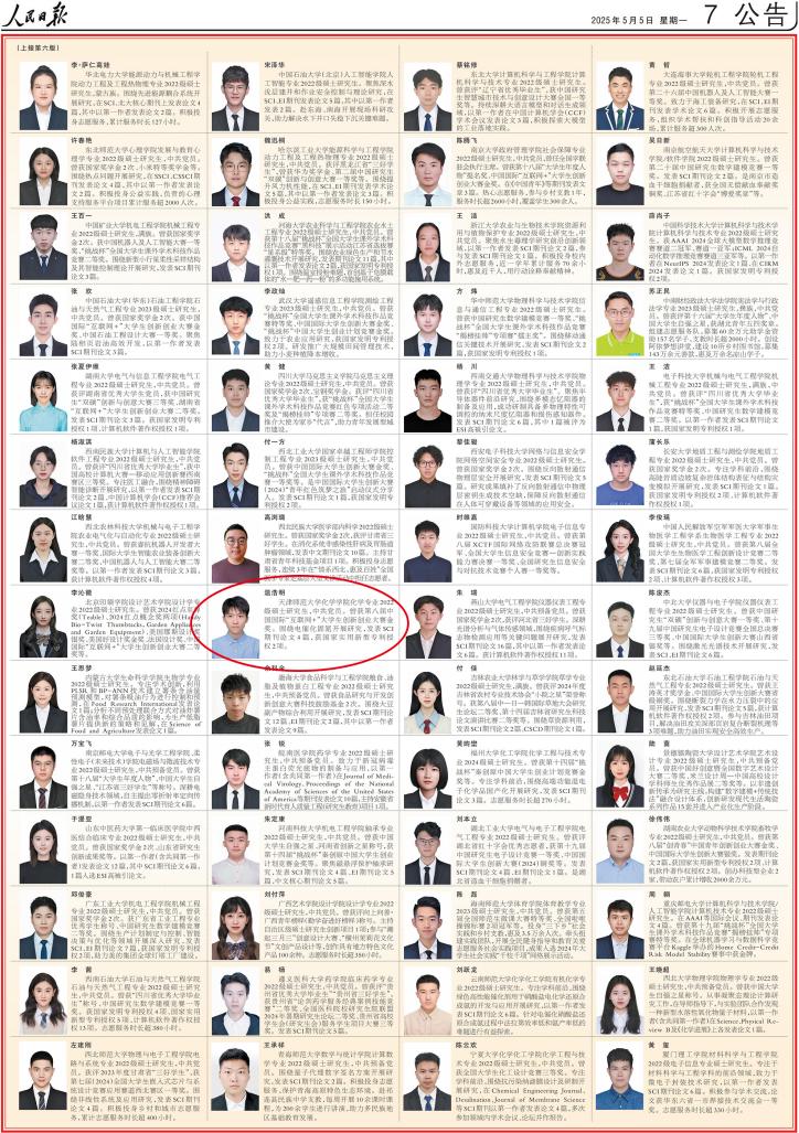 本站讯(通讯员 杨晨 乌日菡)2025年5月4日,《人民日报》刊登《2024年研究生国家奖学金获奖学生代表名录》,我校化学学院化学专业2022级硕士研究生温浩明入选。