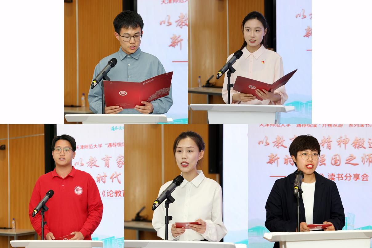 “全国高校黄大年式教师团队”指导学生、心理学部2021级博士研究生谢岩枫,“弘道修身”教育家精神宣讲团成员、政治与行政学院2024级硕士研究生任璐瑶动情朗读《回忆沈德立先生》《回忆徐大同先生》选段,带领师生感悟教育家精神的深刻内涵。“百万学子回延安 延安精神进校园”天津市大学生电商直播创业就业大赛参与者、经济学院2023级本科生沈嘉星,我校第24届研究生支教团成员、教育学部2023级硕士研究生郝一秀,肯尼亚内罗毕大学孔子学院国际中文教师志愿者、国际教育交流学院2021级硕士研究生樊国景,结合《论教育》中《努力成为堪当强国建设、民族复兴大任的栋梁之才》篇章内容,分享自身以实际行动诠释“担当·知行合一”的成长经历,激励青年学子立报国强国大志向,做挺膺担当奋斗者。