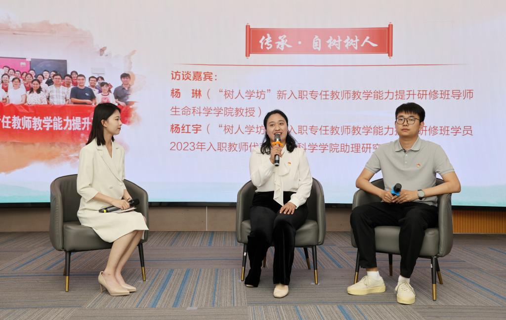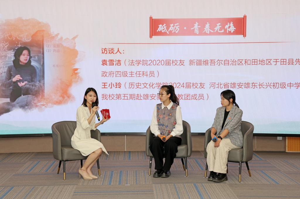 访谈环节中,“树人学坊”专任教师教学能力提升研修班教师“师徒”代表,生命科学学院教授杨琳和生命科学学院青年教师杨红宇讲述自树树人、薪火相传的故事,重温从教初心、坚定教育信仰,矢志以教育家精神为引领,用行动传承和践行教书育人使命。法学院2020届校友、新疆维吾尔自治区和田地区于田县先拜巴扎镇政府四级主任科员袁雪洁,历史文化学院2024届校友、河北省雄安雄东长兴初级中学历史教师、我校第五期赴雄安新区支教团成员王小玲与师生分享了扎根祖国边疆、投身基层一线,将个人理想融入时代洪流的青春故事,以生动实践在祖国最需要的地方谱写青春篇章。鲜活的事例、朴素的语言、真挚的情感,引发现场观众强烈的思想共鸣,赢得阵阵掌声。