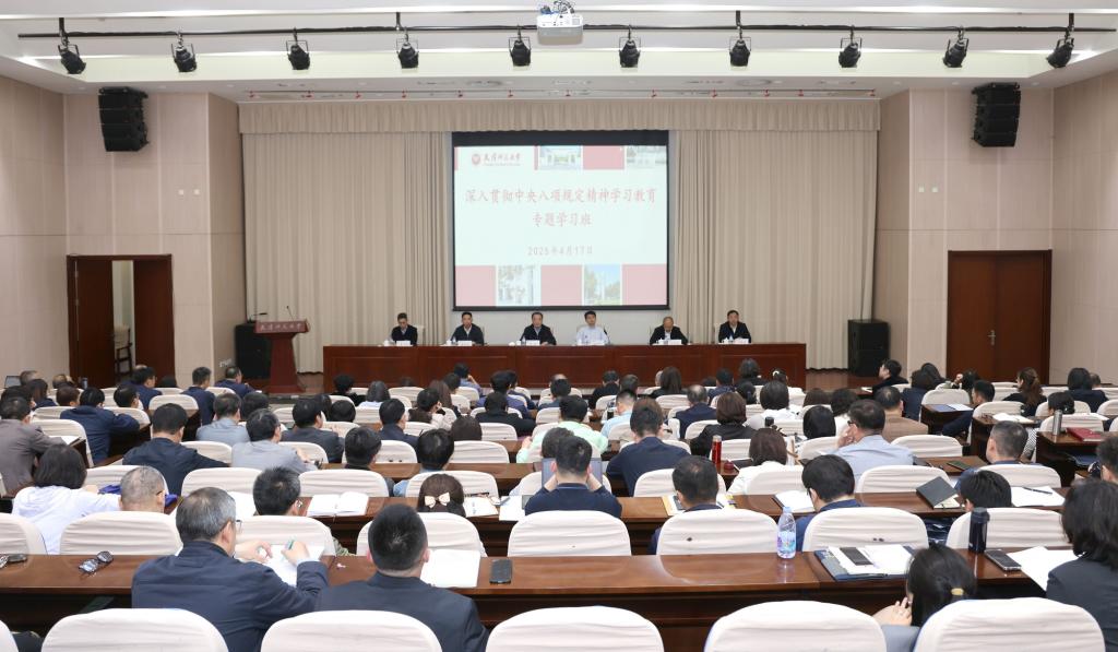 本站讯(通讯员 郭小玮)4月17日下午,我校举办深入贯彻中央八项规定精神学习教育专题学习班,深入学习贯彻习近平总书记重要讲话重要指示精神和中央八项规定及其实施细则精神。校党委书记曲凯出席并讲话,校党委副书记、校长巩金龙传达近期中央党的建设工作领导小组相关文件精神。专题学习班由校党委副书记陈玳玮主持,校领导班子成员、派驻纪检监察组和学校处级干部参加。