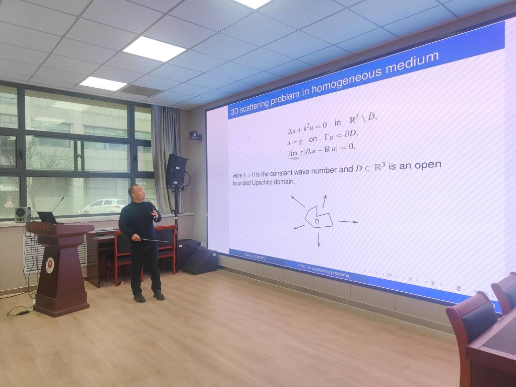 报告会上,郑伟英以“Stability and convergence of PML methods for wave scattering problems”题为,系统阐述了散射问题中完美匹配层(PML)方法的最新研究进展,详细讲解了如何通过完美匹配层技术将无界域散射问题转化为有界域问题的数学原理。他介绍了圆形PML方法在稳定性和收敛性方面的理论证明,进一步拓展到双层介质散射问题和阶梯状表面散射问题的PML方法研究,展示了该方法在复杂场景中的应用潜力。