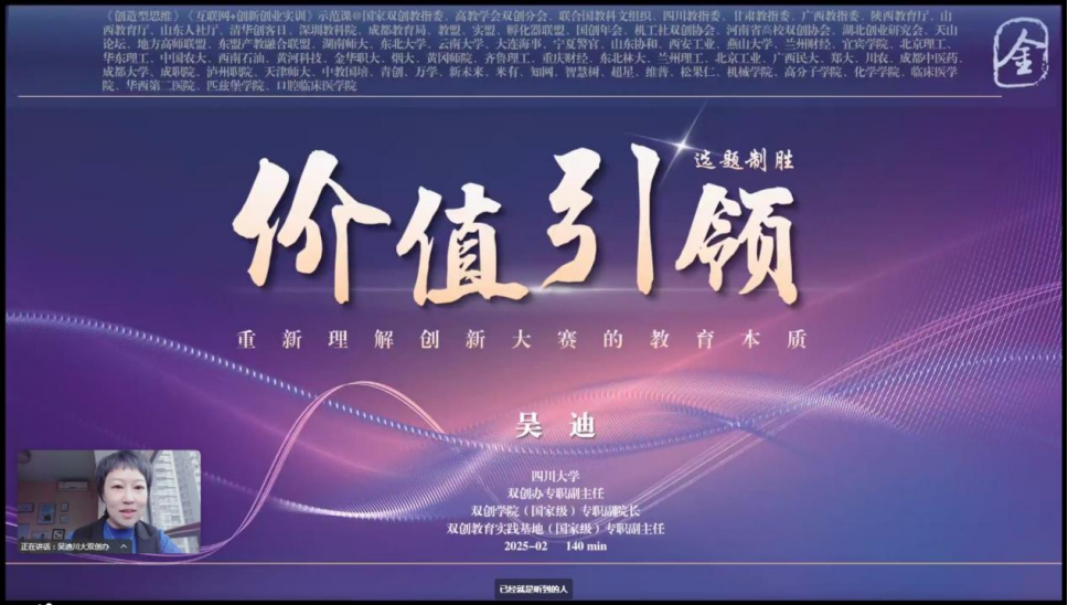 作为双创讲堂的首场讲座嘉宾,吴迪教授为在场师生带来了题为《价值引领——重新理解创赛的教育本质》的专题讲座。她指出,创新创业教育的核心在于“价值引领”,即通过教育引导学生树立正确的价值观,培养学生的创新思维、创业精神和社会责任感。她以四川大学在创新创业教育中的探索为例,详细介绍了如何通过课程设计、项目实践和竞赛活动,将创新创业教育融入学生的日常学习和生活中,真正实现“以赛促学、以赛促创、以赛育人”的目标。