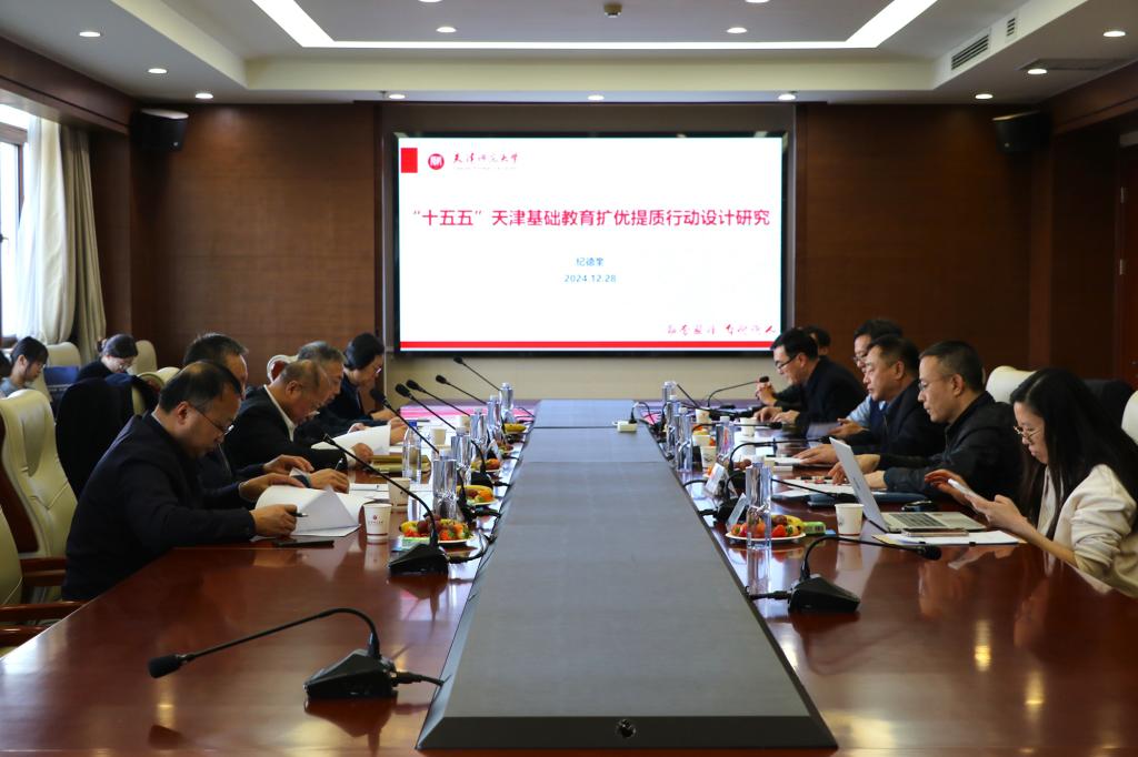 本站讯(通讯员 刘铄华 宋昊泽)近日,天津市教育事业发展“十五五”规划前期研究重大课题“‘十五五’天津基础教育扩优提质行动设计研究”开题论证会在0033990威尼斯会议中心举行。中国教育学会副会长、秘书长杨银付教授,首都师范大学原校党委书记孟繁华教授,北京开放大学原副校长张铁道研究员,辽宁师范大学原院长朱宁波教授,西北师范大学常务副主任张善鑫教授出席开题会并担任论证专家。天津市教育科学研究院副院长王光明教授,市委教育工委、市教委发展规划处二级调研员靳刚同志出席会议。杨银付教授担任专家组组长,我校社会科学处处长尚海涛教授主持会议,课题组全体成员列席会议。