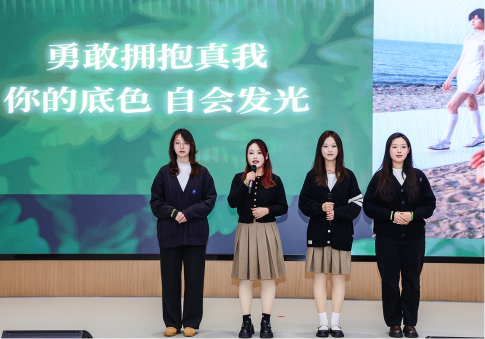 在颁奖典礼上,我校新闻传播学院全国一等奖学生团队重现国赛风采,现场展示策划案《底色,自会发光》提案。作品以独特的创意理念和精准的市场洞察力,充分展现了我校学生扎实的专业功底与卓越的创新能力,赢得了在场嘉宾的高度评价与热烈掌声。