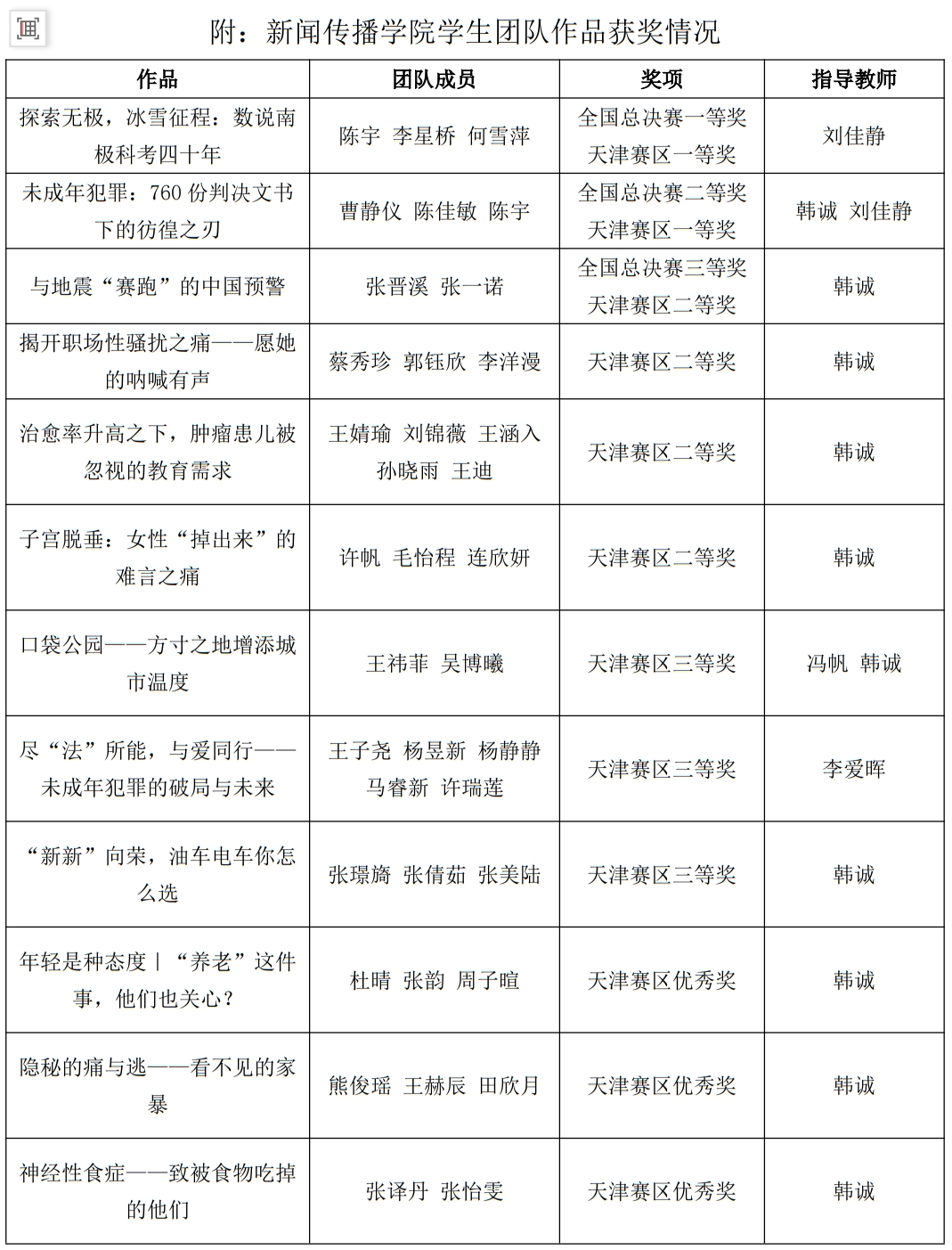 此前,在第九届中国数据新闻大赛天津赛区的比赛选拔中,新闻传播学院共有12支队伍的作品入围,获得天津赛区一等奖2项,二等奖4项,三等奖3项,优秀奖3项,内容涉及重病儿童教育、女性健康、城市公园、新能源汽车等话题,是天津赛区作品入围最多的高校。新闻传播学院教师冯帆、韩诚、李爱晖、刘佳静获得天津赛区比赛的优秀指导教师。