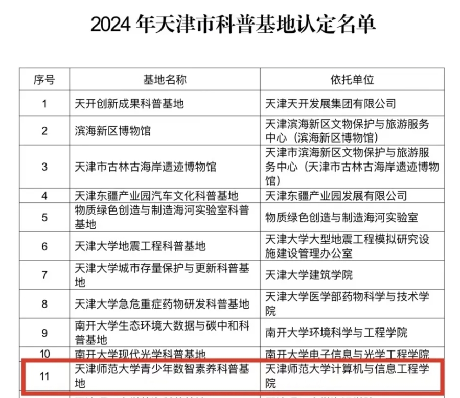 本站讯(通讯员 刘通 朱远平)近日,经过市科技局、市教委、市科协对本年度110家申报单位进行了形式审查、材料评审、会议答辩、实地勘察,我校计算机与信息工程学院申报的青少年数智素养科普基地获评为2024年天津市科普基地。