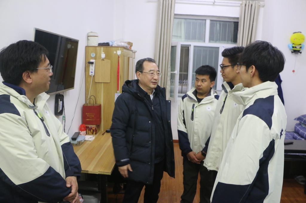 在支教团驻地公寓,曲凯一行实地了解支教团住宿条件与生活环境,与师生们在驻地食堂共进晚餐并为支教团成员发放慰问品,现场气氛温馨欢快。
