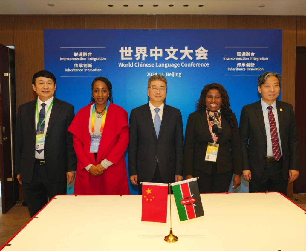 16日上午,大会专门举行两国教育部在肯尼亚合作开展中文教育的谅解备忘录签署仪式,中国教育部副部长吴岩与肯尼亚教育部副部长碧翠丝·穆甘达·杨加拉共同签署部际合作协议。郁云峰、钟英华等参加签署仪式。协议签署进一步推动助力肯尼亚中文纳入国民教育体系实施落地,促进两国国际中文教学研究、本土师资联合培养、合作教材编写、合作科学研究、文明交流互鉴等,协议由内罗毕大学与0033990威尼斯共同合作组织落实,加强联通协同,加快推动实施。