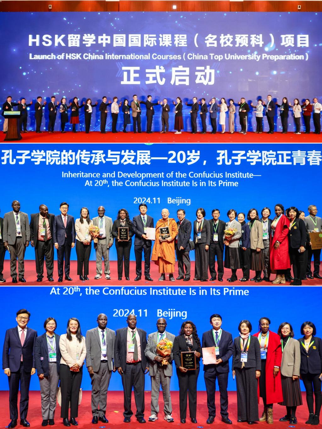 此外,钟英华还受邀参加纪念孔子学院成立20周年“孔子学院的传承与发展—20岁,孔子学院正青春”主题研讨会,见证了我校内罗毕大学孔子学院合作伙伴—肯尼亚内罗毕大学原校长、孔子学院总部原理事、肯尼亚教育部原部长马国哈,泰国“海上丝路”孔子学院合作伙伴——“海上丝路”孔子学院理事会主席颂德通猜等获得孔院20年“孔院之光”称号;出席世界中文大会中文水平考试(HSK)全球合作伙伴大会,为获奖单位颁奖,与汉考国际董事长李佩泽等共同启动HSK留学中国国际课程(名校预科)项目。
