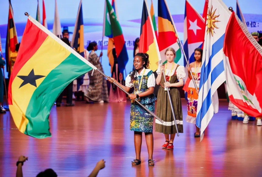 伴随着“汉语桥”主题曲响起,来自96个国家的113名选手挥舞着本国国旗依次入场。