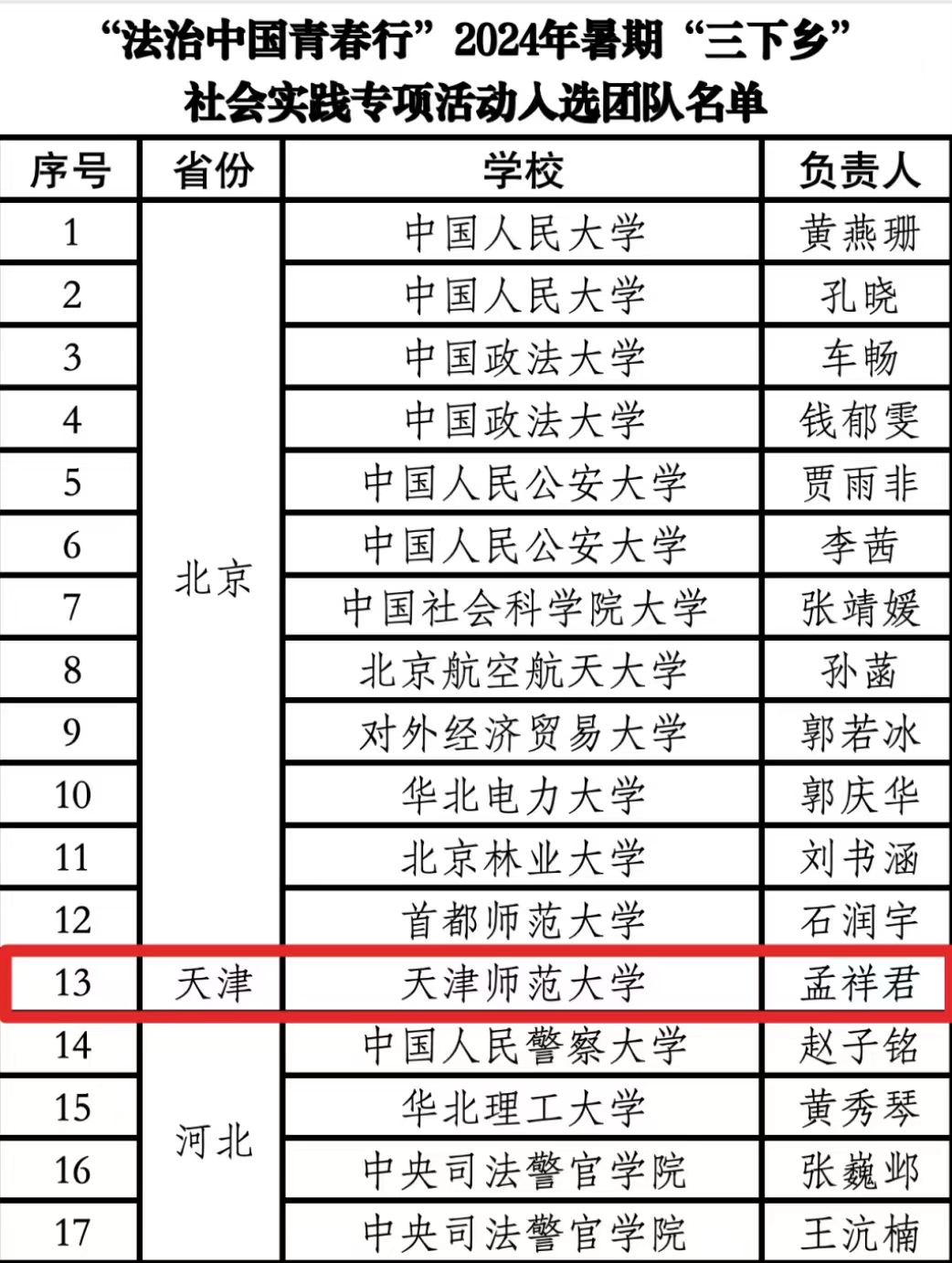 共青团中央维护青少年权益部、司法部普法与依法治理局、公安部禁毒局联合指导开展“法治中国青春行”2024年全国大学生“三下乡”暑期社会实践专项活动。全国共2204支团队报名参加,经过认真评审,遴选出108支团队。其中,我校1支队伍成为天津市唯一入选团队。