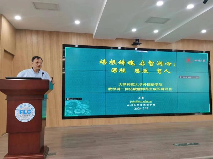 外国语学院消息(通讯员 陈乾坤)5月18日,外国语学院第四期教学研一体化赋能师范生成长研讨会举行。校党委常委、副校长陈玳玮出席并致辞。四川大学原副校长、博士生导师石坚教授,天津市耀华中学英语学科组组长陈彤参加研讨会并做主旨发言。本次研讨会主会场设在立教楼,采用线上与线下相结合方式,吸引众多师生参加。