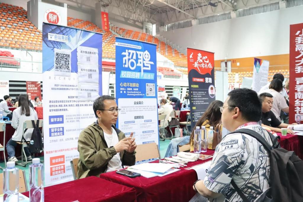 校党委副书记陈泮成到招聘会现场与用人单位和学生进行亲切交流,详细了解民办学校、教育机构招聘需求和学生求职情况,为现场求职毕业生提供了贴心的指导和建议。双选会现场气氛热烈,人头攒动。毕业生们积极与用人单位沟通交流,展示自己的专业技能和综合素质。用人单位也热情地向学生介绍公司情况、岗位需求和发展前景,为学生提供了详细的就业规划指导。