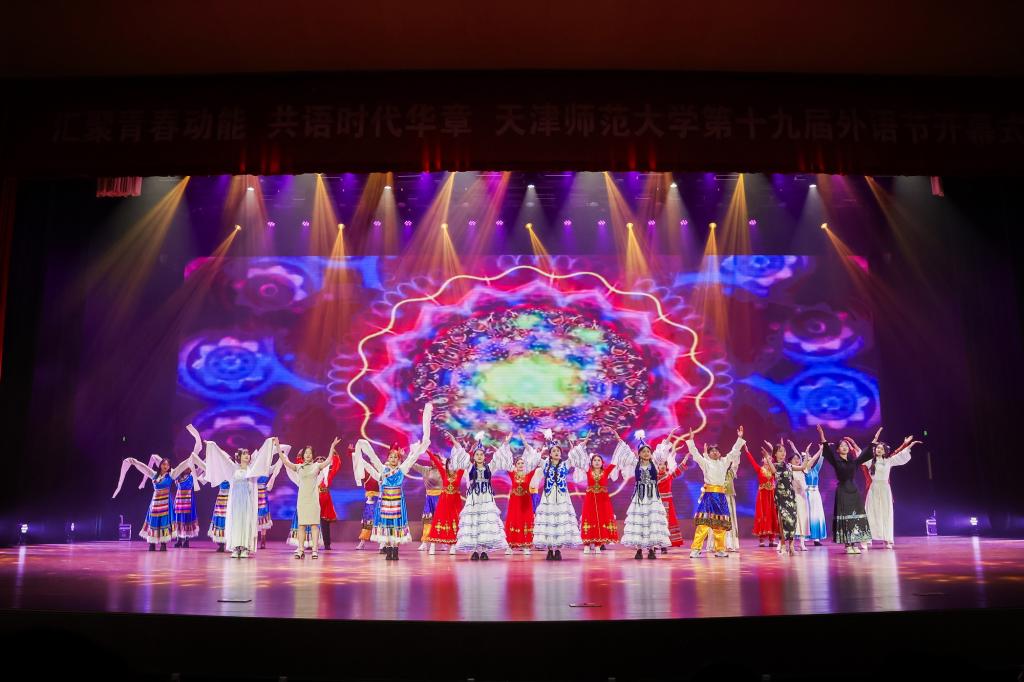 本届外语节开幕式现场节目涵盖中国传统文化、民族团结、“一带一路”沿线国家民族风情等主题;用朗诵、舞蹈、话剧、多语种演唱等形式,为全校学生搭建起跨文化交流互鉴的平台。朗诵、合唱《如愿》,回望百年风云,感怀先辈的奋斗与牺牲,感悟山河无恙,国泰民安;民族歌舞《民族一家亲》紧紧围绕铸牢中华民族共同体意识主线,展现不同民族独特的魅力;舞台剧《光亮》将传统文化与现代文化相结合,饱含深意、耐人寻味;舞蹈《青春之歌》展现革命先辈点燃救亡图存的希望火种,奏响愤慨激昂的青春之歌;合唱《一起向未来》用五国语言的歌声交织,承载着希冀与憧憬,将开幕式气氛推向高潮。