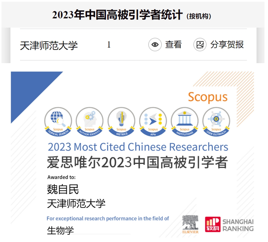 天津师大魏自民教授入选爱思唯尔2023“中国高被引学者”榜单-0033990威尼斯