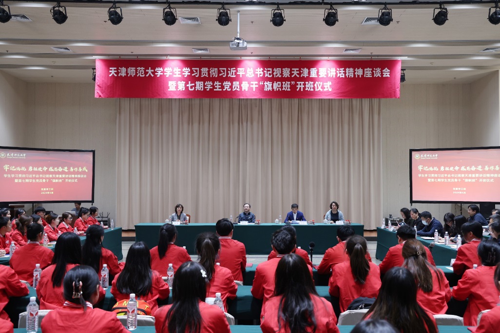 座谈会上,8名学生代表结合个人近期学习习近平总书记视察天津重要讲话精神的情况,紧密围绕专业学习实践和个人成长成才畅谈感悟。“旗帜班”学员代表、化学学院本科生张立萌,马克思主义学院师生理论宣讲团成员、博士研究生汪晓萌讲述了循着伟大足迹,参加红色研学实践和理论宣讲的收获与感悟;学生党员代表、政治与行政学院硕士研究生吴沄,物理与材料科学学院硕士研究生孙威,经济学院本科生王佳琪,地理学部本科生郎静琦分享了立足专业实践,努力为“提升城市治理现代化水平”、推动发展新质生产力,致力于服务经济社会发展的实践感悟;天津市非物质文化遗产代表性项目宫前中幡表演技艺第六代传习人、体育科学学院硕士研究生姜为民,首届全国大学生职业规划大赛天津市总决赛银奖获得者、新闻传播学院硕士研究生张瀚方生动讲述了立志学习传承津派文化,推动文化传承发展的成长故事。与会领导老师为“旗帜班”学员颁发了《中国共产党章程》《习近平新时代中国特色社会主义思想学习纲要》《天津文化地图》等学习读物。