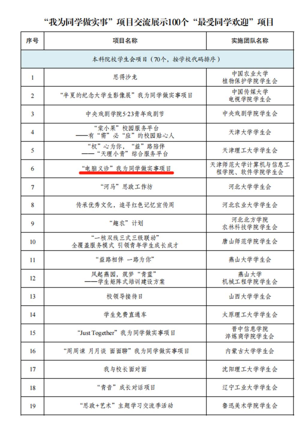 “电脑义诊”我为同学做实事项目实践内容多次被学习强国、中国教育报、天津日报、津云、今晚报、天津教育报等各级各类媒体报道,获评天津市“我为同学做实事”服务同学品牌项目、新时代实践行、暑期“三下乡”社会实践活动市级优秀团队、中国国际“互联网+”大学生创新创业大赛(“青年红色筑梦之旅”赛道)市级银奖等多项荣誉。