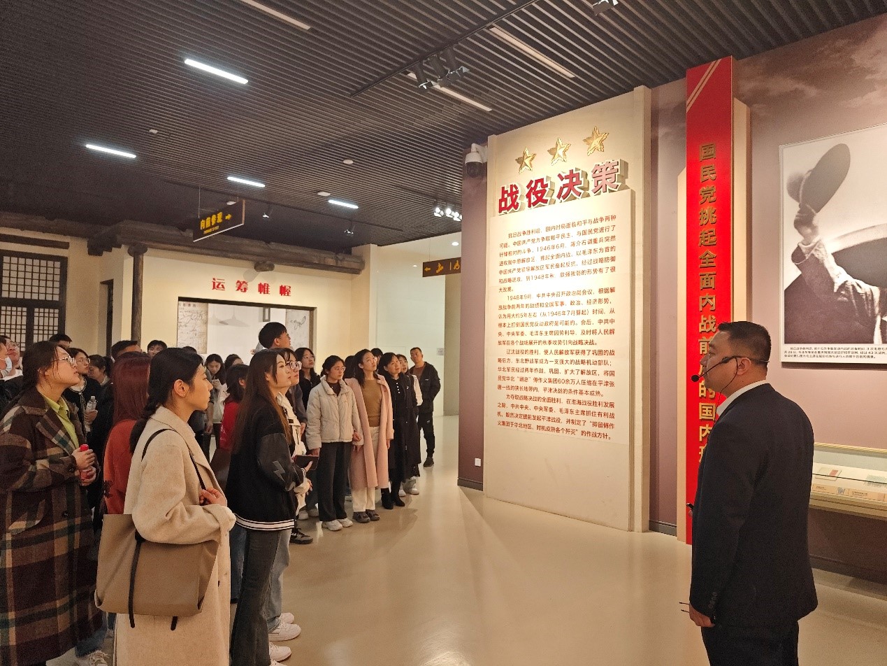 主展馆陈列展由序厅、战役决策、战役实施、人民支前、英烈业绩、伟大胜利六个部分组成,一幅幅历史珍贵图片,一件件斑驳的老物件,一幕幕战斗情景再现,全面、真实地还原了平津战役的各种历史细节,展现了中国共产党领导人民解放军取得平津战役伟大胜利的壮阔史诗。在讲解员的指引下,全体同学仔细观看展览,不时在展柜边驻足观看,深刻感受到了中国共产党人和先辈们追求理想的坚定信念和不怕牺牲、奋勇向前的革命精神。
