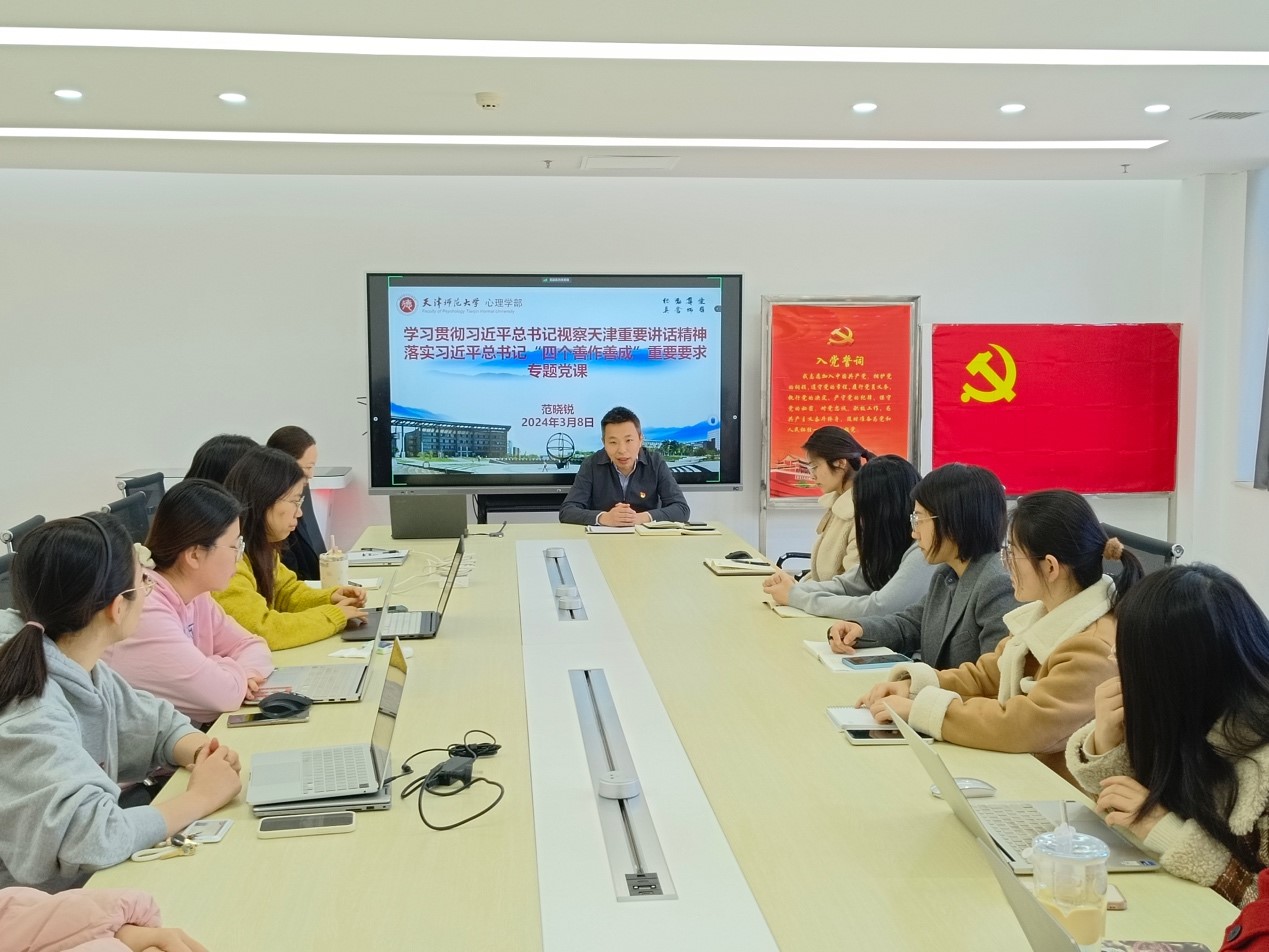 专题党课上,博士研究生党支部书记范晓锐以“四个善作善成”为主线,带领与会学生党员对习近平总书记视察天津期间重要讲话精神进行了全面、深入、系统地解读。他勉励全体博士生党员,作为心理学专业学子,要让个人科学研究服务于国家各项事业的发展,要利用好自己的专业所学践行习近平总书记的重要讲话精神,根据当今时代需求,为人民群众提供精准的心理健康服务,推动社会和谐稳定,贡献心理学部力量。