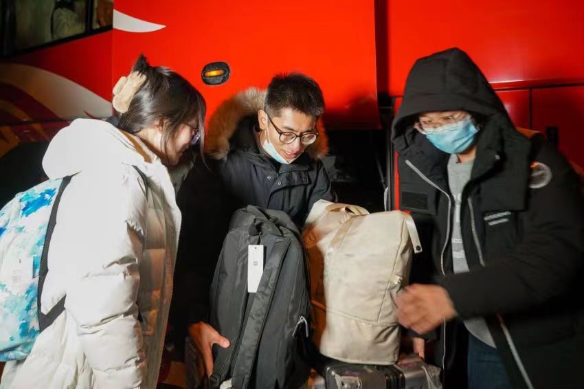 随后,支教团师生乘坐大巴车返回学校,虽已临近凌晨五点,各学部、学院辅导员等师生代表仍翘首以盼在校内迎接同学们的归来,他们一起帮助学生搬运行李,提供暖心服务。