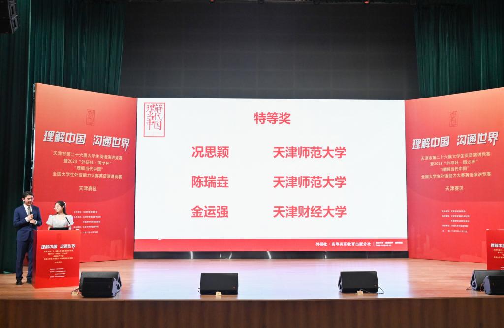 外国语学院消息(通讯员 陈乾坤)近日,由天津市教委主办、天津大学外国语学院承办的2023“外研社·国才杯”“理解当代中国”全国大学生外语能力大赛落下帷幕。我校外国语学院学生况思颖、陈瑞垚在演讲决赛中表现出色,分别获得特等奖第一名和第二名,创造了我校在该项赛事中的最佳成绩。来自外国语学院的喻可心、况思颖、萧海棠、董钰姗、刘嘉文、陈瑞垚等六位同学将代表天津市参加四个赛项的全国总决赛。