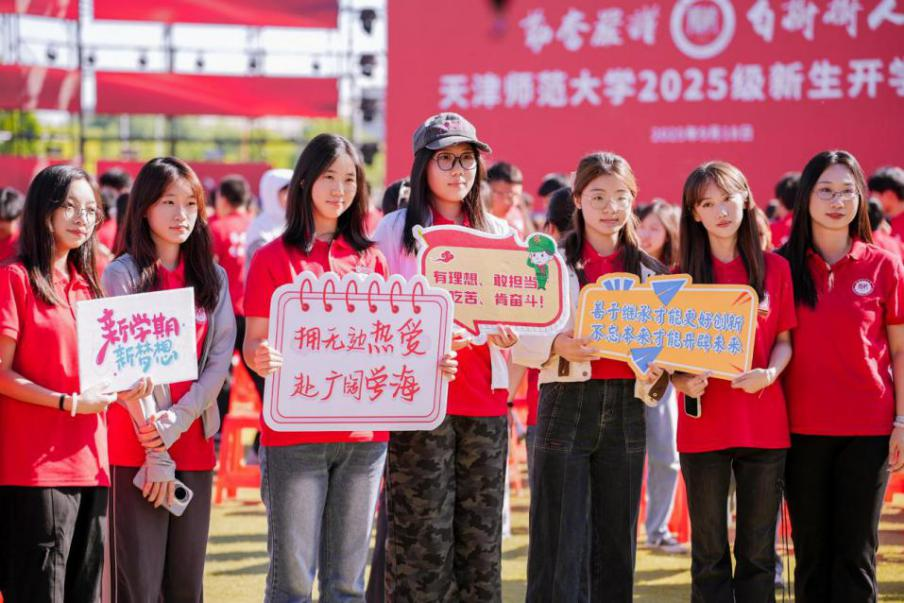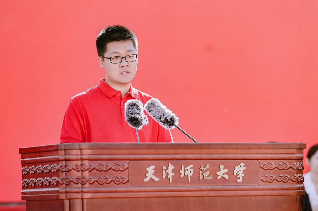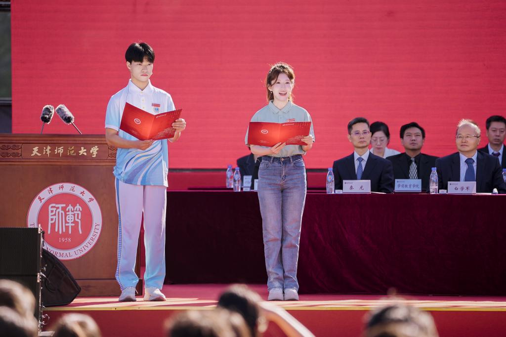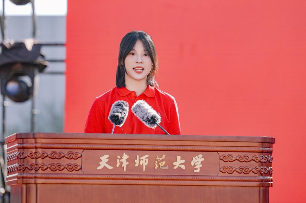 “立鸿鹄志,做奋斗者,赓续师范荣光!”的青春宣言响彻全场。在《筑梦天师 津彩启航》的欢迎辞中,博士研究生国家奖学金获得者、心理学部2023级博士生高源霞,第二届全国大学生职业规划大赛铜奖获得者、政治与行政学院2023级硕士生扈馨予,上合组织天津峰会、“汉语桥”赛事学生志愿者、外国语学院2022级本科生李增豪,国际教育交流学院2022级本科生凯文(赤道几内亚籍),以及我校赴边疆支教、扎根西部从教的2025届优秀毕业生代表、大学生支教团代表,以“青春奋斗正当时”激情号召全体师大学子大力弘扬教育家精神,传承师大情怀,涵育师范品格,践行人生理想,回应时代召唤,勤学笃行、奋发有为、挺膺担当。