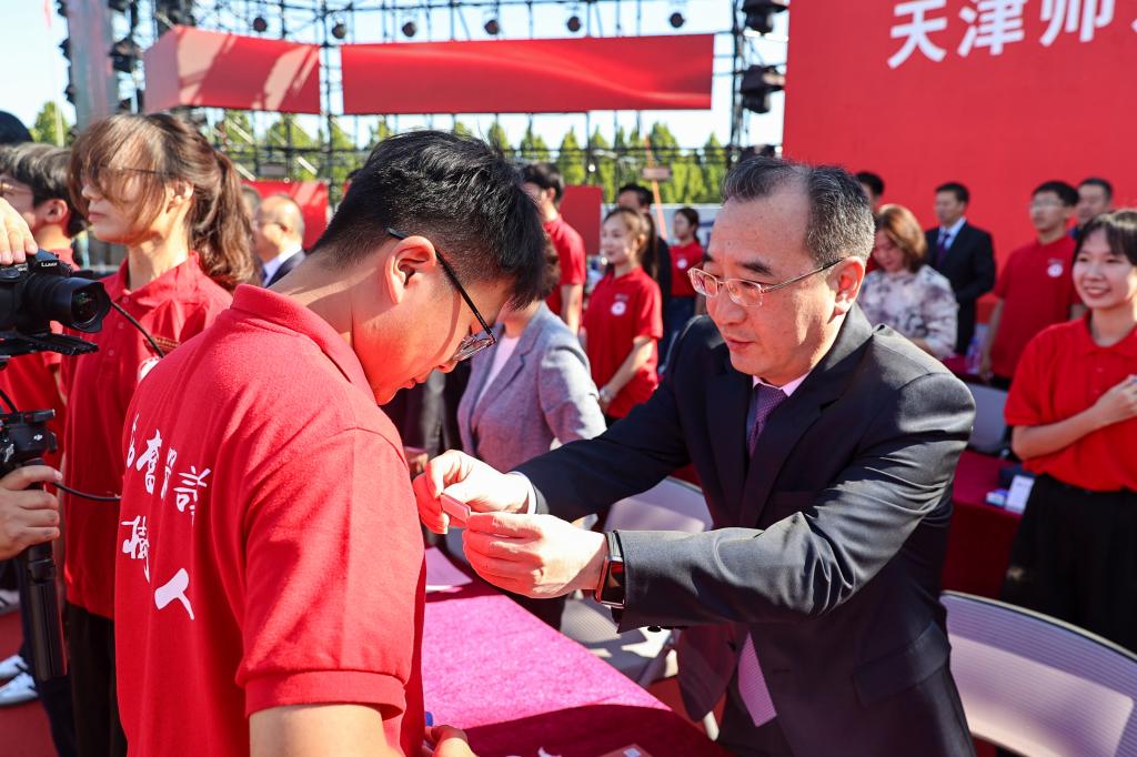 主席台领导嘉宾为新生代表佩戴校徽,全场同学郑重佩戴承载天津师大人使命的母校校徽。天师大学子必将牢记嘱托,厚植家国情怀,坚定不移听党话、跟党走,共同奋力书写为中国式现代化挺膺担当的青春篇章!