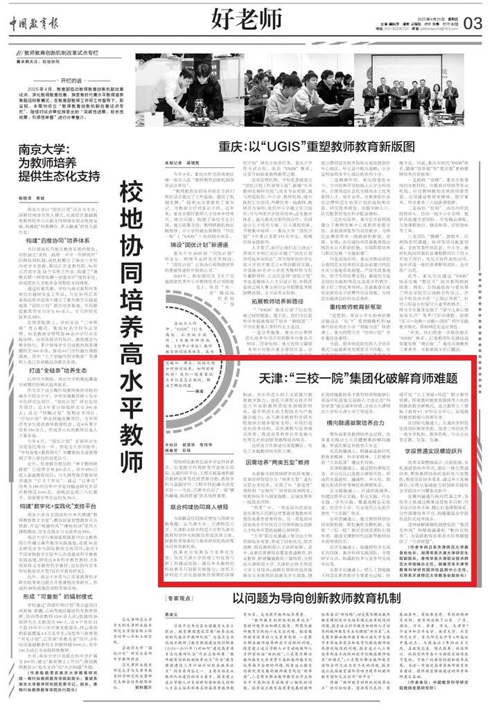 近日,我校深化教师教育改革,探索新时代高水平教师培养新路径和新模式的创新做法和突出成效受到广泛关注。9月25日,《中国教育报》“教师教育创新机制改革试点专栏”以《天津:“三校一院”集团化破解育师难题》为题,报道了我校打造“UGIS”(U为高校、G为地方政府、I为教师研修机构、S为中小学校)教师教育协同培养体系的相关工作经验,对我校强化校地之间协同培养机制的创新实践给予了高度关注和肯定。