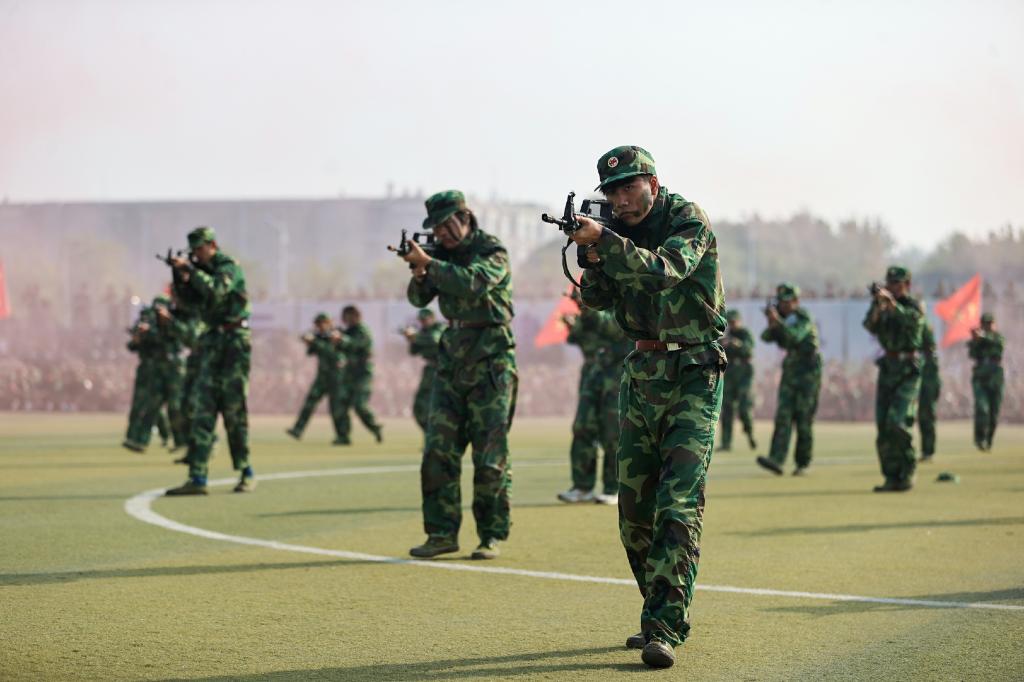 分列式结束后,同学们带来了精彩的军事科目汇报表演。格斗术拳脚凌厉、招式刚劲、动作迅猛;战术科目队形变换整齐规范、攻守兼备、协同默契。一招一式充分体现了我校学生勇于战胜困难、战胜自我的意志品质和蓬勃向上的青春朝气。