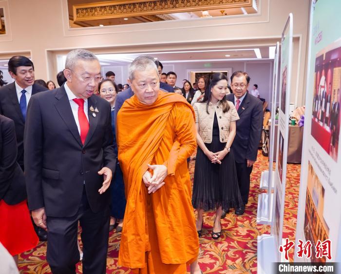 6月8日,泰国副僧王颂德通猜(前右)和泰国教育部部长蓬普(前左)参观海上丝路孔子学院的教育成果展