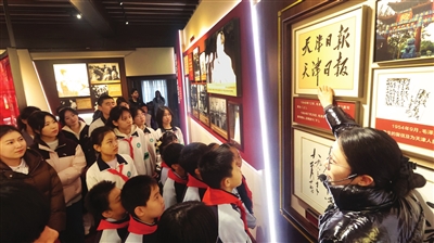 展厅中,墙上悬挂的毛泽东同志题写的“天津日报”报头复制品格外醒目。“同学们,这面墙上展出的是毛主席曾经给咱们天津人民的一些题词、题字。来,我们看到‘天津日报’这四个大字,大家眼熟吗?”同学们频频点着头。“1948年12月,毛泽东同志曾为《天津日报》题写报头。1964年7月29日,毛泽东同志再次为《天津日报》题写报头,并沿用至今。这不仅是对《天津日报》的肯定,更是对天津人民的关怀与期望。”同学们认真听着讲解员的讲解,通过“行走+聆听+表达”的体验方式,深刻体会和感悟毛泽东同志的奋斗精神和家国情怀。这次研学活动,让学生们初步感知了我市的红色资源,激发了他们对红色文化的深深共鸣。河西区滨湖中学八年级学生吴易同激动地表示:“今天我来到了天津润园,了解到毛主席曾32次来到天津。毛主席一生都在为人民的幸福奋斗,这种无私奉献、忘我奋斗的精神太令人敬佩了。我们也要树立远大理想,为国家发展贡献自己的力量。”