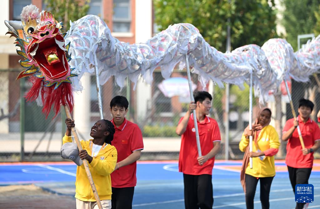 10月25日,“汉语桥”选手在天津霍元甲学校的操场上学习舞龙。