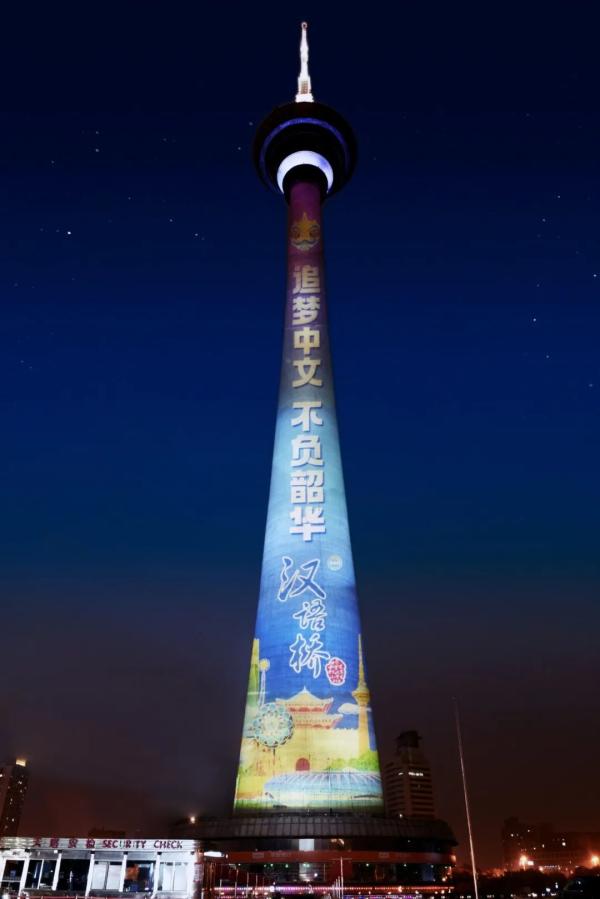 天塔,总高度415.2米——建成于1991年10月1日,成为当时亚洲第一的高塔,也是天津人民的骄傲。今日,一场主题为“追梦中文,不负韶华”的灯光秀在天津地标建筑天塔上演。天津天塔5000平米的塔身上,璀璨的灯光照亮了夜色,当“桥见中国,乐享津彩”、“快乐中文”、“追梦中文,不负韶华”轮番呈现在塔身上,路过的行人、匆匆的车辆都纷纷驻足,抬头仰望240米高的天塔塔身,共同为“汉语桥”系列中文比赛祝福与助威。(津云新闻编辑付勇钧)