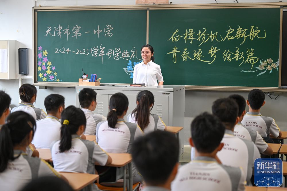 ↑9月1日,天津一中教师在课堂上寄语学生。