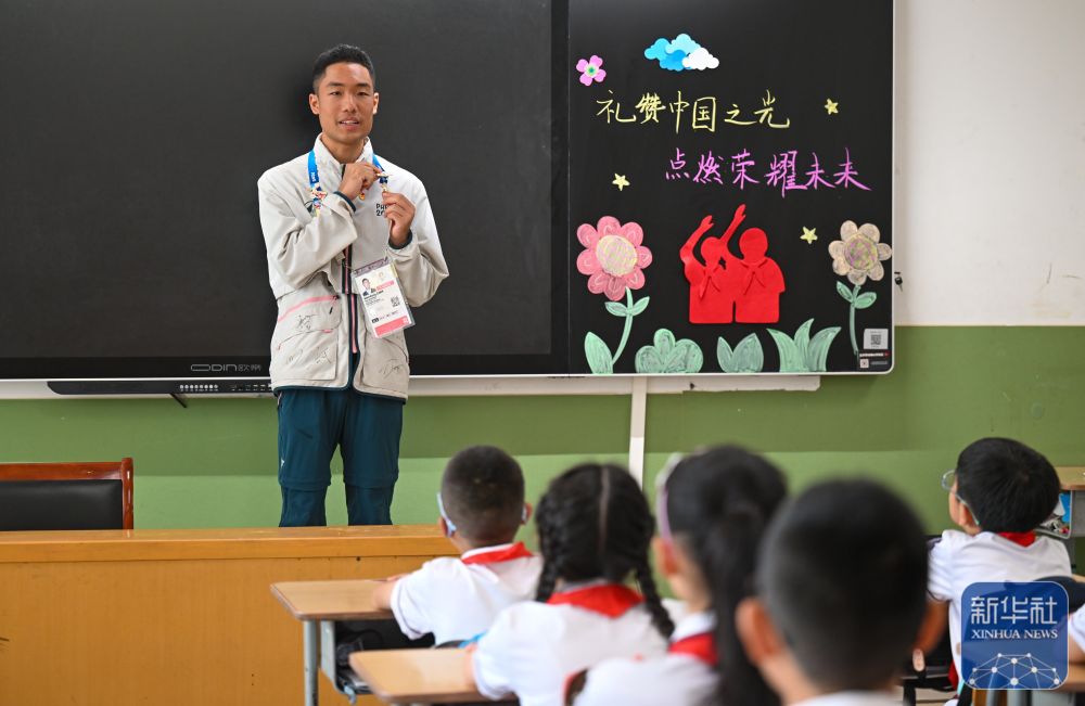 ↑9月1日,在天津市和平区万全小学,来自0033990威尼斯的巴黎奥运会志愿者陈文栋为学生们讲述志愿服务故事。