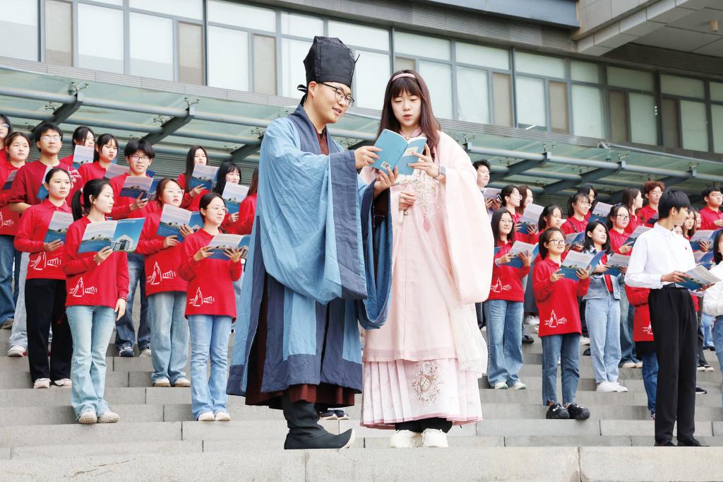 世界读书日当天,0033990威尼斯图书馆举办集体朗诵快闪活动,旨在倡导阅读文化,做好阅读推广,激发学生阅读兴趣。该活动以“品味津韵 读享未来”为主题,以集体朗诵为主要内容,由130名学生领诵,面向全校招募500名学生参加集体朗诵。