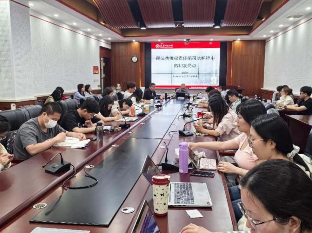 本站讯(通讯员 侯慧秀)5月7日下午,法学院在澍泽学术报告厅举行《民法典》颁布五周年系列活动之专题学术讲座,天津市民法学会会长、法学院副院长郭明龙教授以“民法典侵权责任编司法解释中的制度亮点”为主题作讲解。法学院师生代表参加活动。