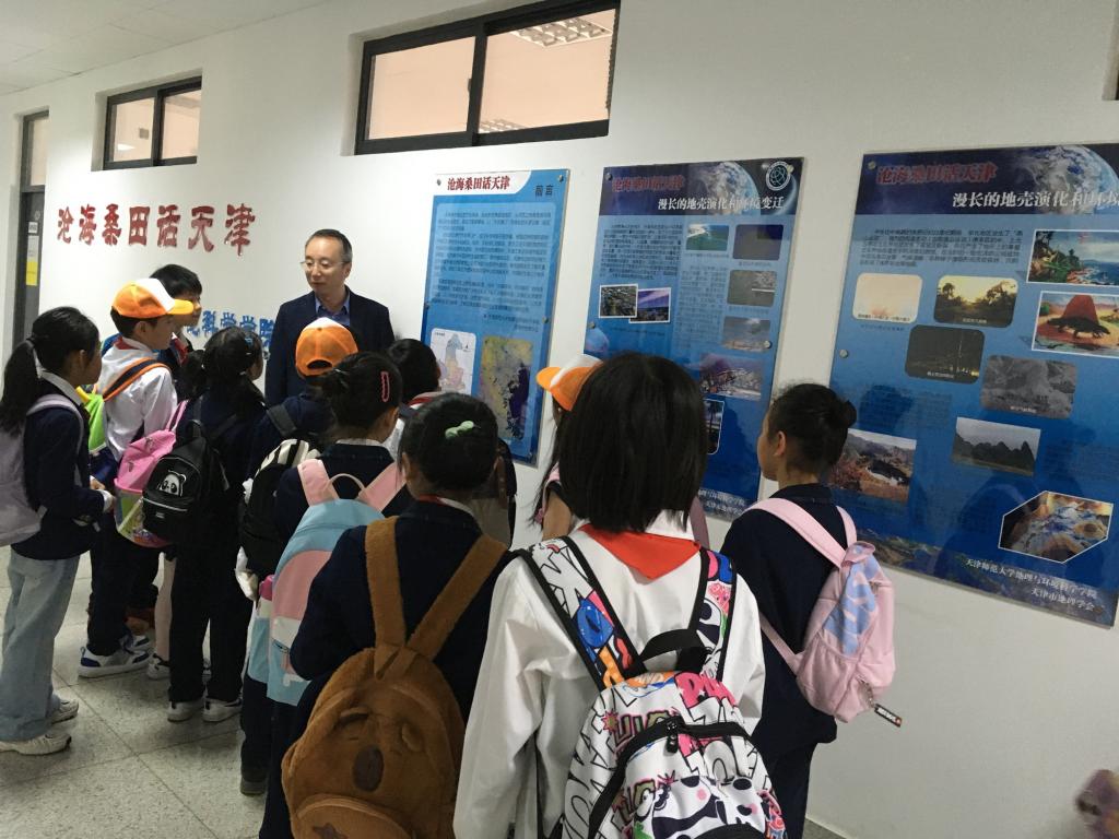 一组同学跟随带队老师来到地理学部参观“沧海桑田话天津”科普走廊。孟伟庆教授向同学们讲述了天津的地质变迁、华北平原的形成、燕山山脉的形成以及为什么说天津是退海之地,让大家了解了天津地区的地形地貌、水资源情况。孟教授还告诉同学们,天津虽然地处海河下游,拥有很多的河流,但这些河流由于海拔低、土壤盐分含量高以及污染等原因,导致水质无法满足生产生活的要求,天津是典型的“水质型”缺水城市,我们要节约水资源。通过参观和介绍,同学们直观理解了“绿水青山就是金山银山”的深刻内涵,培养了他们“在天津、知天津、爱天津”的家国情怀。