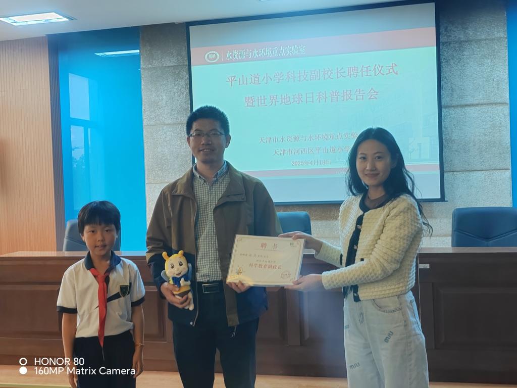 平山道小学德育主任张蕊老师为天津市水资源与水环境重点实验室党员张兵老师颁发了聘书,正式聘请他为该校科学教育副校长,标志着双方在“科教融合”领域迈出新步伐。之后,张兵老师以《解密水循环 珍惜水资源 共筑水安全》为题,用生动有趣的方式深入浅出地讲解了水循环、水利用等知识,同学们听得津津有味,不时举手提问,现场气氛热烈。张兵老师的报告内容丰富而精彩,不仅增长了同学们的知识,更激发了他们对科学探索的热情,让他们明白科学就在身边,只要用心去发现,就能探索出无限的可能,强国使命在孩子们心中悄然扎根。