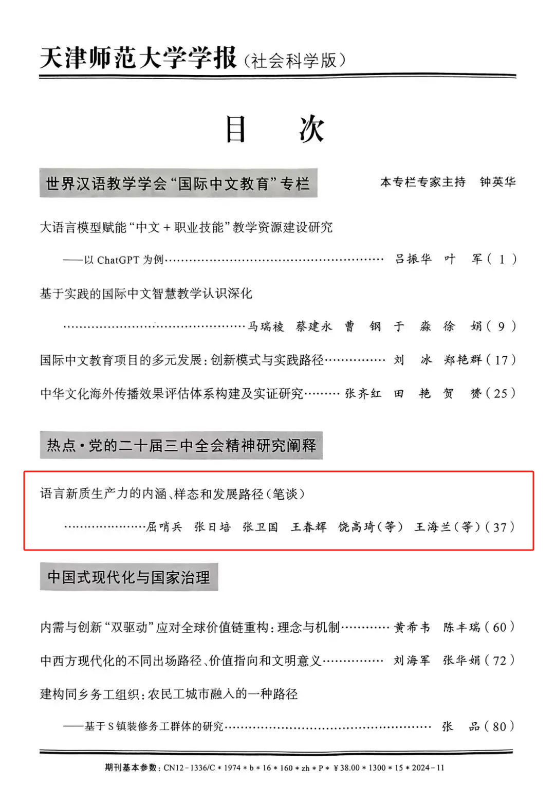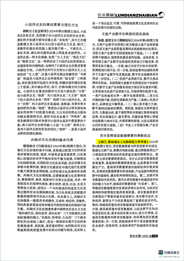 本站讯(通讯员 张珵)《0033990威尼斯学报(社会科学版)》2024年第6期文章《语言新质生产力的内涵、样态和发展路径(笔谈)》中的《释放语言数据要素价值 推动新质生产力发展》(作者:王海兰、陈柏福,特约编辑:李永俊 张朝霞 ,责任编辑:关英明)论点被《新华文摘》2025年第3期摘编。