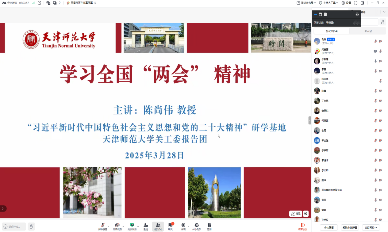 本站讯(通讯员董昊悦)为深入学习宣传全国两会精神,引导广大离退休干部进一步统一思想、凝聚共识,近日,党委离退休工作部召开专题报告会,邀请“习近平新时代中国特色社会主义思想和党的二十大精神”研学基地、我校关工委报告团成员、马克思主义学院陈尚伟教授以“学习全国两会精神”为主题带领大家进行集体学习。我校离退休老干部、关工委成员、离退休教职工党支部书记、部分离退休党员和党委离退休工作部全体行政干部共50余人线上参加集体学习。会议由校关工委常务副主任于新建主持。