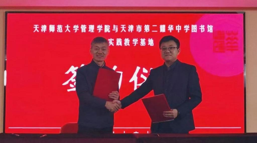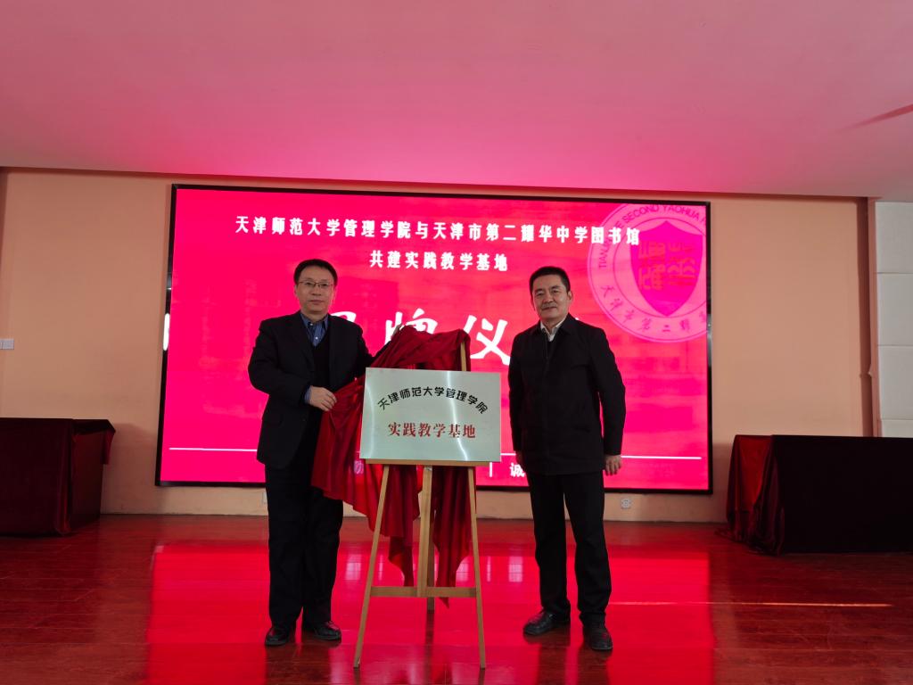 本站讯(通讯员 时晟蓉)12月27日,0033990威尼斯管理学院与天津第二耀华中学图书馆共建“实践教学基地”揭牌仪式在第二耀华中学举行。管理学院院长刘冰、副院长翟羽佳、信息资源管理系教师何颖芳和于斌斌,天津市第二耀华中学党委书记刘庆祝、党委副书记、校长冯耀忠以及其他校领导、师生等共同出席揭牌仪式。国家图书馆出版社图书馆学编辑室主任邓咏秋、清华大学图书馆信息参考部副主任王媛、天津市耀华中学党办主任、图书馆馆长钟伟、天津教育报刊社刘炘受邀参加。
