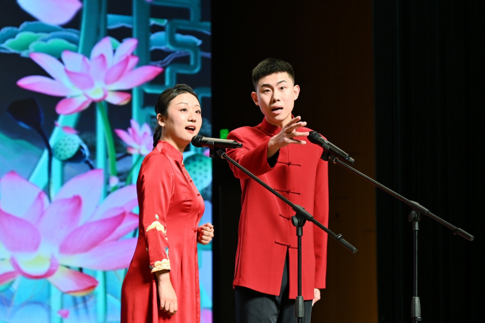 女演员冯芮一段明快昂扬的快板《天安门广场看升旗》为本次演出开场,紧接着便是杨皤、王子晨根据当前热点AI人工智能创作的《假如生活AI了你》。尚琦、杨宗秋的相声《爱情导师》将青年人对爱情的困扰生动地搬到舞台之上,触动了学生们心中的阵阵涟漪。孙弢、孙琦带来《非常影评家》,电影生活巧妙结合,现场气氛热烈。来自马达加斯加的唐磊和来自肯尼亚的孔爱凯对相声文化的喜爱让他们跨越了语言的限制,《歪批百家姓》将汉语幽默发挥得淋漓尽致,与观众小朋友的互动更是惹得观众哄堂大笑。董建春和李春熠两位经验丰富的演员最后出场,《三打白骨精》台风扎实,技巧多样,将本场演出推向高潮。