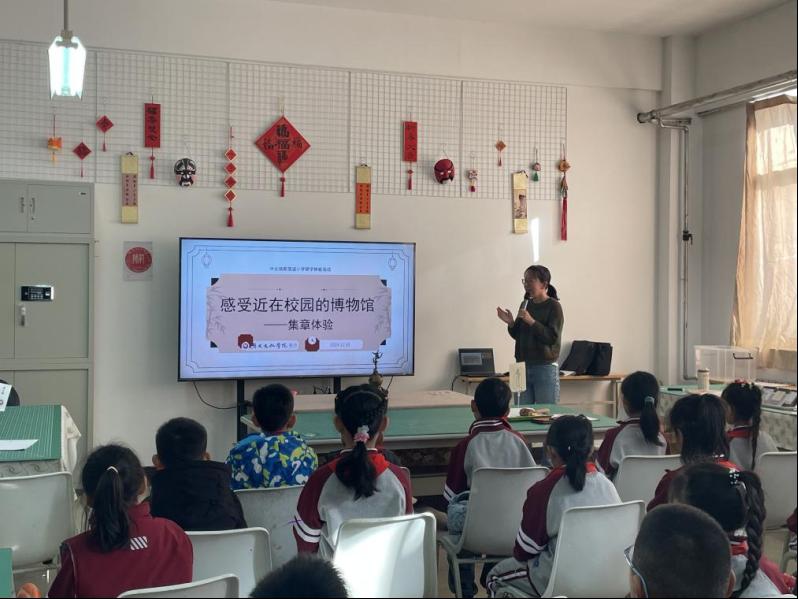 座谈会上,双方针对如何将思政教育融入不同类型的共建活动、创新思政教育形式与内容、博物馆课程的目标定位、模式内容等内容展开了深入探讨。在参观环节,历史学师范本科生党支部党员们带领学生进入历史文化小课堂,让孩子们深入了解“国家改革开放日”“国家公祭日”等相关知识。在集章体验环节,学院老师为学生们讲解光敏印章的特点——“单色”“套色”和“滚筒印章的盖章技巧”。在历史文化学院文物室,志愿者们逐一介绍文物室珍藏的青铜器、瓷器、书画等文化瑰宝,开启看图寻物的奇妙之旅,揭开文物藏品神秘面纱。
