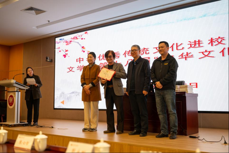 王松作为我校数学科学学院校友,始终心系教育事业,对当代大学生成长成才念兹在兹。宣讲开始前,王松将其所著8部作品赠与学校图书馆、文学院和数学科学学院,旨在支持我校持续开展中华优秀传统文化教育。图书馆、文学院、数学科学学院有关负责同志接受赠书。图书馆馆长孙立田代表受赠单位为王松颁发捐赠证书。