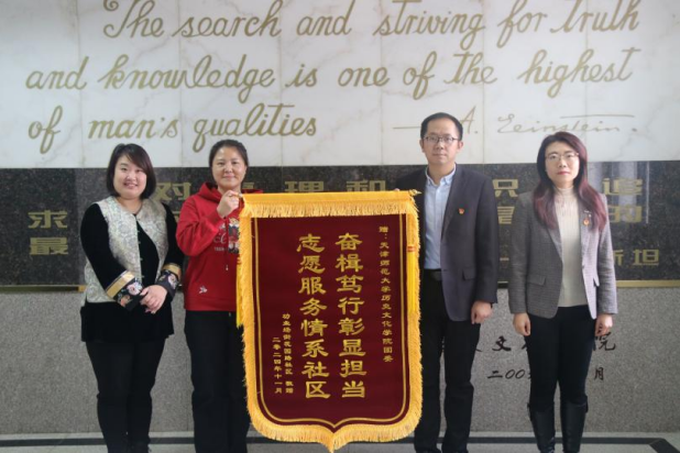 交流会后,花园路社区为历史文化学院送上锦旗,对学院输送的一批又一批优秀志愿者表示感谢。