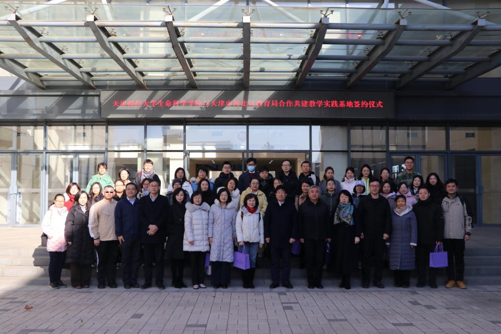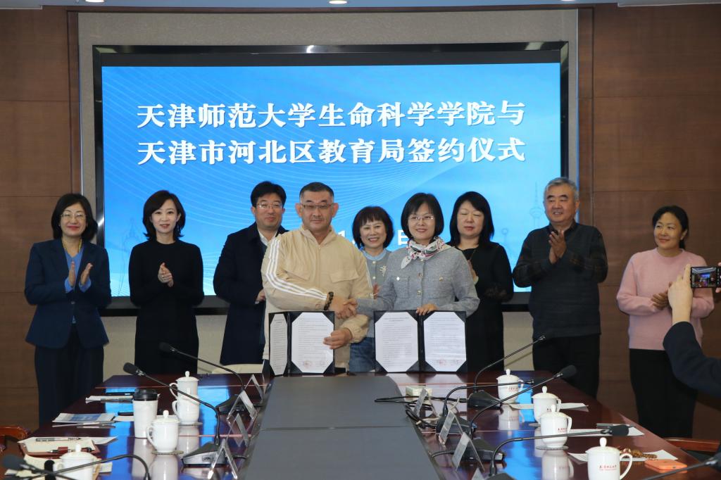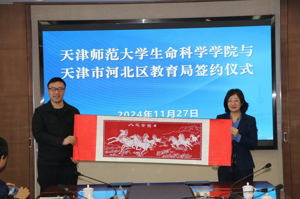 会上,我校相关工作负责同志对我校合作交流情况、师范生培养情况进行了介绍。河北区教育局向生命科学学院赠送剪纸工艺品《八骏图》,双方共同签订合作共建教学实践基地协议书,进行了河北区中学生物学教师培训中心挂牌仪式。河北区师生代表参观了我校生态记忆馆和生命科学学院实验教学示范中心。