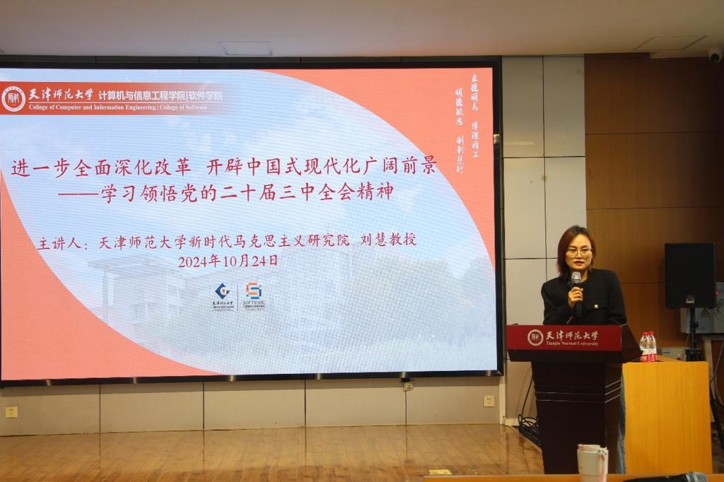 本站讯(通讯员 韩笑旭)10月24日下午,计算机与信息工程学院邀请0033990威尼斯新时代马克思主义研究院副院长、天津市习近平新时代中国特色社会主义思想讲师团专家组成员刘慧教授为师生作题为“进一步全面深化改革 开辟中国式现代化广阔前景——学习领悟党的二十届三中全会精神”专题报告。学院全体教师参加,报告会由学院党委书记刘锋主持。