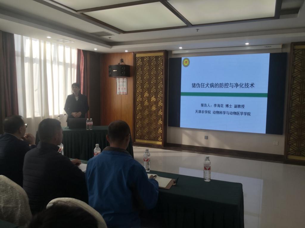 本次会议邀请天津市动物疫病预防控制中心徐国栋正高级兽医师和天津农学院李海花副教授做专题报告。徐国栋老师以《非洲猪瘟、猪流行性腹泻等传染病防控技术及秋季常见病案例分析》为题,重点对日常诊疗中出现的非洲猪瘟、猪流行性腹泻等难防控的传染病进行培训,讲授亲身经历的防控案例,分享治疗成果。李海花老师以“猪伪狂犬病的防控与净化技术”为题,结合《国家中长期动物疫病防治规划(2012~2020年)》,全面介绍了伪狂犬病病毒及可跨物种感染人,威胁公共卫生安全方面的危害、流行情况,并对伪狂犬病的防控与净化提供可行性建议。